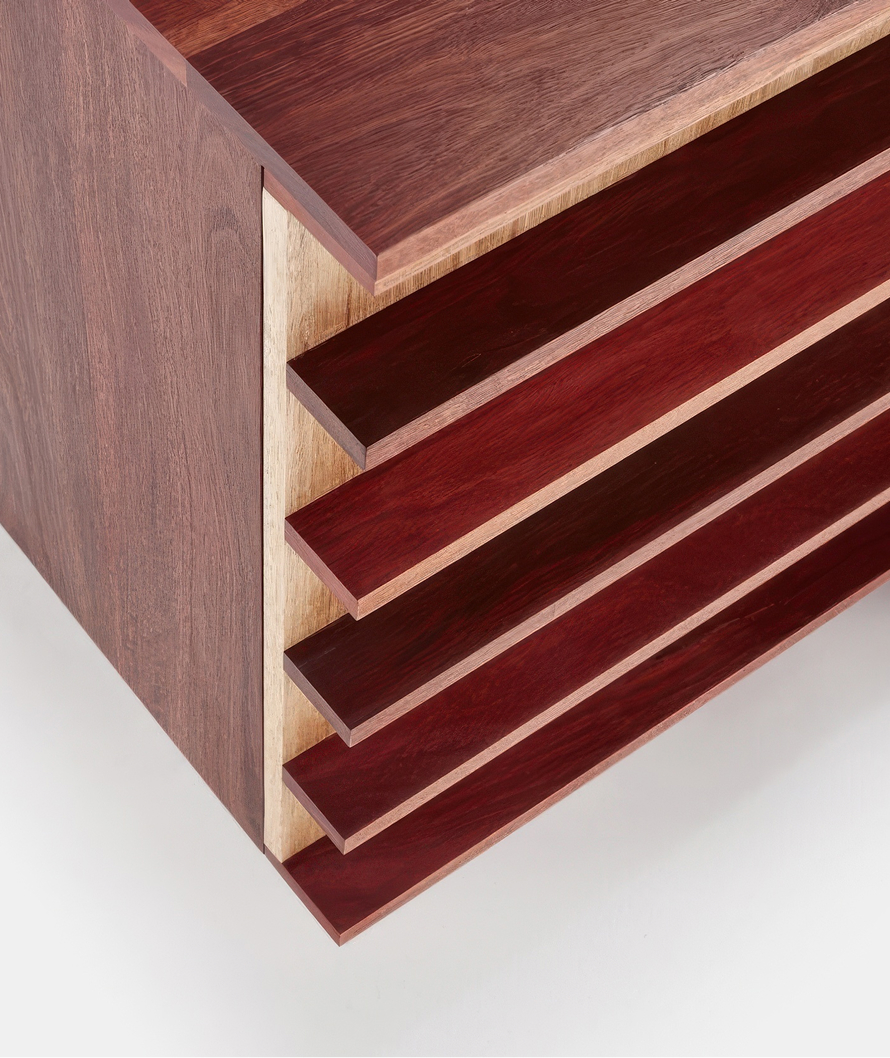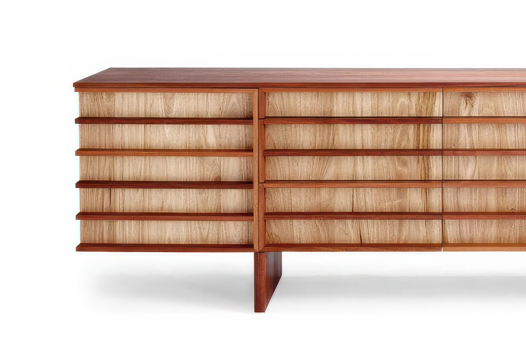 One of the starting points for Ashleigh’s Linear Sideboard was his appreciation for the work of Danish designer Kaare Klint. Designing solid timber furniture in the late 1930s Klint was strongly influenced by the Bauhaus movement. So when Ashleigh discovered the Darwin hardwood in Arnhem Land, as well as the local ash species, he saw an opportunity to create a ‘solid’ furniture piece, one that could appeal to a high-end market and that would have longevity. Although there’s a simplicity to the strong horizontal lines in Ashleigh’s wooden sideboard, there’s also a sense of playfulness.